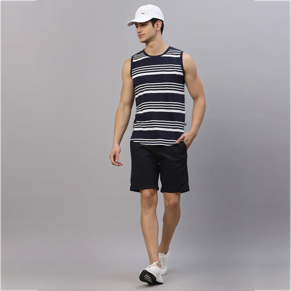 • Navy Blue Striped Slim-Fit Innerwear Vest, has round neck, sleeveless