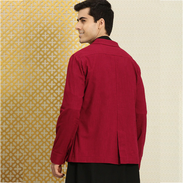 Jashn: This line draws upon traditional costumes for inspiration while rendering an India modern aesthetic. Rich textiles with minimal yet exquisite zari embroideries. Ideal for celebrating the evening with a contemporary take on festive attire. Product Design: Red solid single-breasted blazer Has a notched lapel Long sleeves Button closure