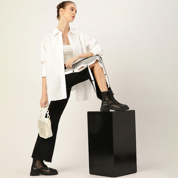 Black side striped knitted mid-rise track pants, has an elasticated waistband with drawstring closure, one back pocket, snap button closure on the side